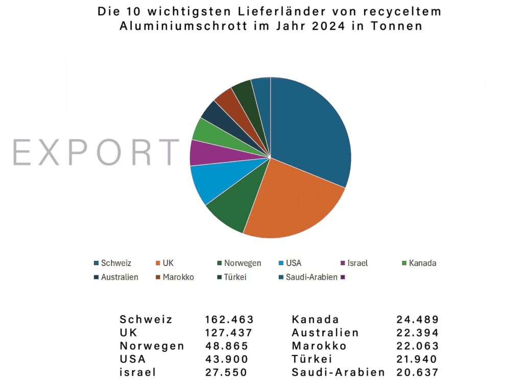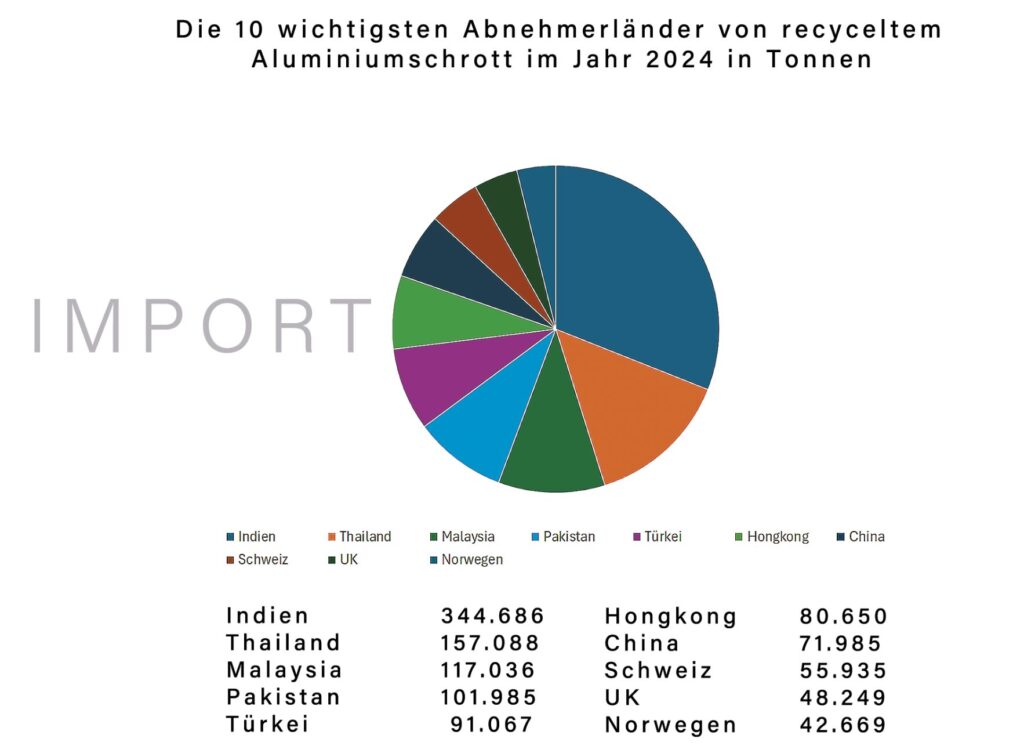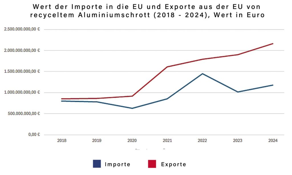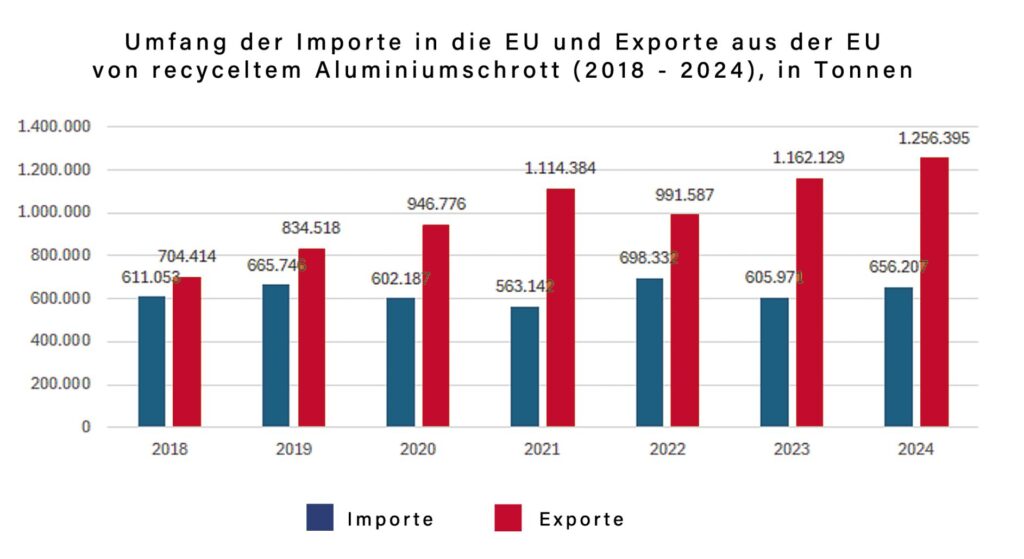 Der in der EU recycelte Aluminiumschrott von rund 5 Millionen Tonnen wird zu 80 Prozent in der EU weiterverarbeitet, rund 20 Prozent gehen in den Export. Der europäische Außenhandel verzeichnete in den Jahren 2023 bis 2024 einen leichten Anstieg der Importe und Exporte.