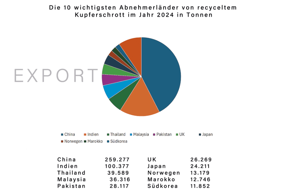 Die drei wichtigsten Abnehmerländer von recyceltem Kupferschrott aus Europa waren im Jahr 2024 (in Tonnen)