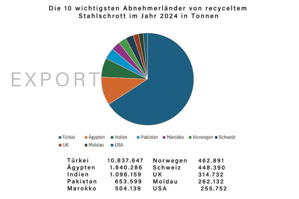 Die drei wichtigsten Abnehmerländer von recyceltem Stahlschrott aus Europa waren im Jahr 2024 (in Tonnen)