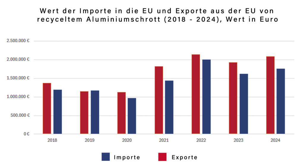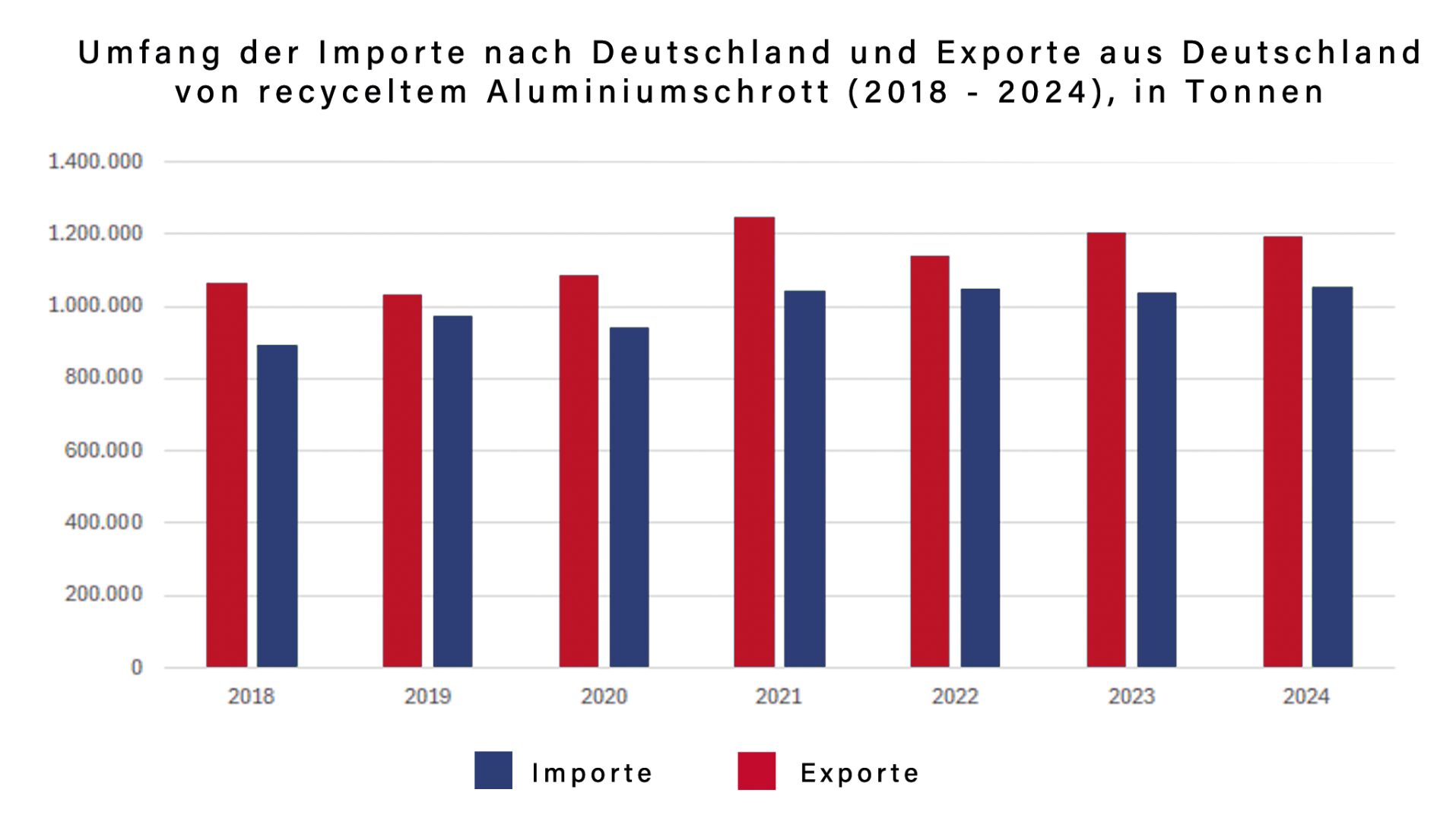 Der deutsche Außenhandel mit recyceltem Aluminiumschrott weist in den Jahren 2018 bis 2024 stets einen leichten Exportüberschuss auf, was darauf hindeutet, dass nicht alle in Deutschland aufbereiteten Mengen im Inland verarbeitet werden konnten und deshalb an ausländische Werke exportiert wurden.