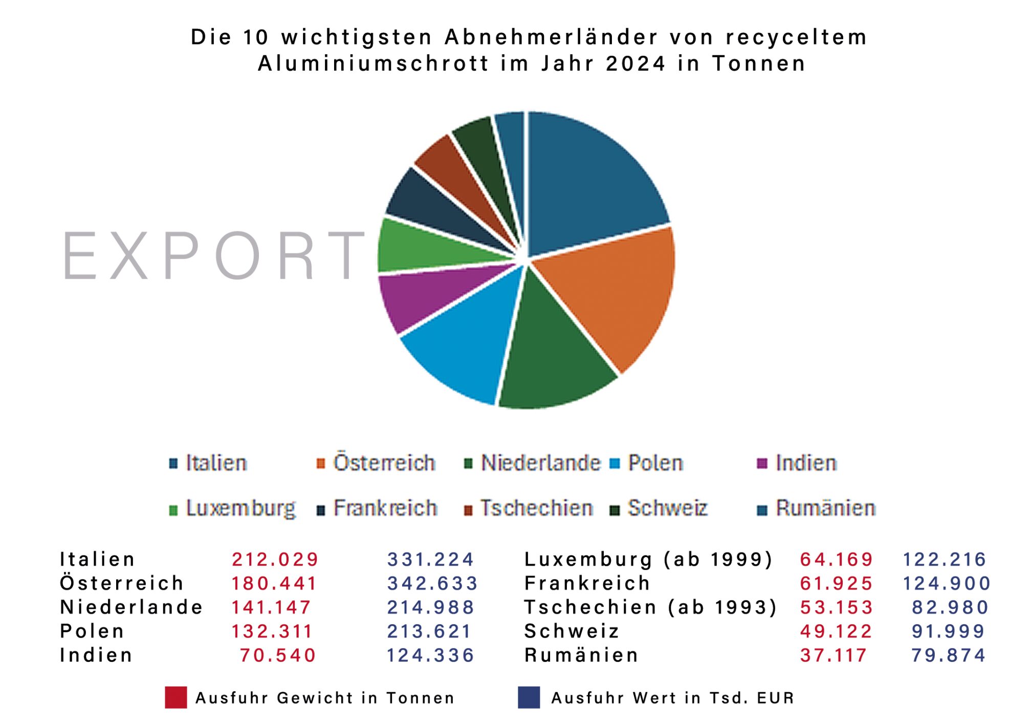 Die Tatsache, dass Italien an erster Stelle steht, veranschaulicht, dass die Aluminiumhütten in Italien einen hohen Bedarf an recyceltem Aluminium haben und Deutschland eine wichtige Quelle für diesen Rohstoff ist. Dies zeigt, dass Deutschland über eine effiziente Recyclinginfrastruktur verfügt und in der Lage ist, wertvolle Ressourcen wie Aluminiumschrott in der gewünschten Qualität aufzubereiten.