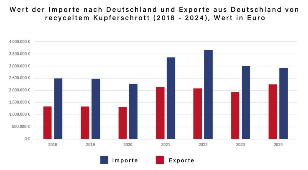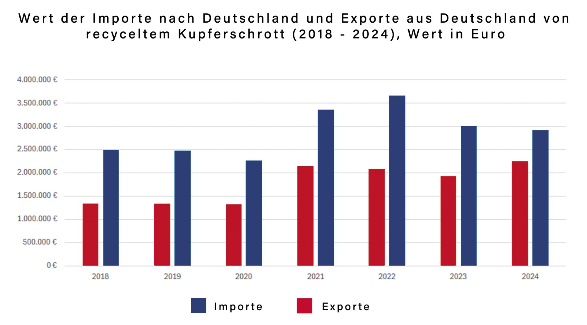 Der deutsche Außenhandel mit Kupferschrotten weist in den Jahren 2018 bis 2024 stets einen Importüberschuss auf, was darauf hindeutet, dass ein Großteil der deutschen Verarbeitungskapazitäten mit Kupferschrotten aus dem Ausland versorgt werden. Dies verdeutlicht die gegenseitigen Vorteile des internationalen Handels mit Schrotten, die Länder untereinander und miteinander haben.