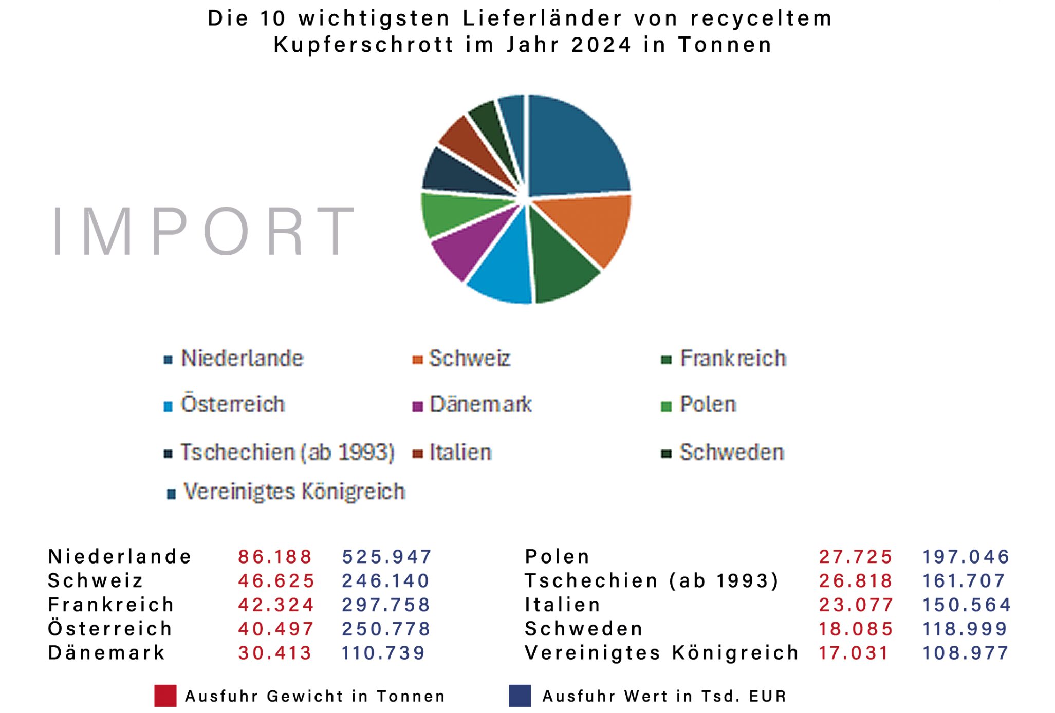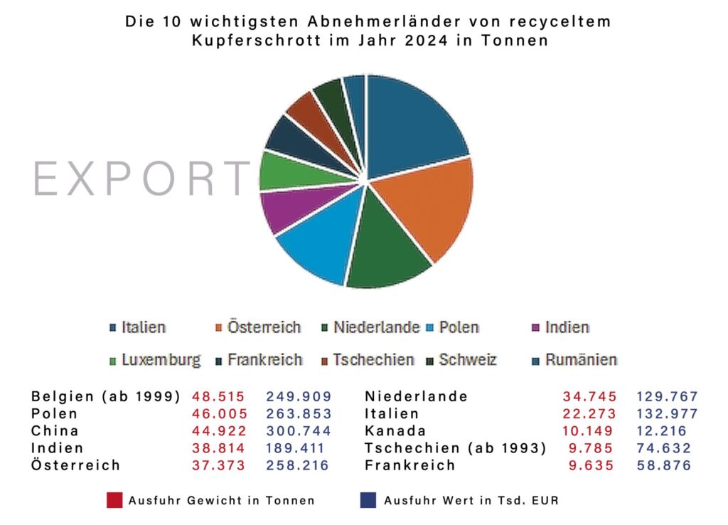 Polen hat im Bereich Kupfer- und Kupferlegierungs- schrotte viele Schmelzwerke. In Belgien gibt es ebenfalls Kupferschmelzbetriebe und ebenso in den Niederlanden. Beide Länder sind aber auch Knotenpunkte für den internationalen Handel.