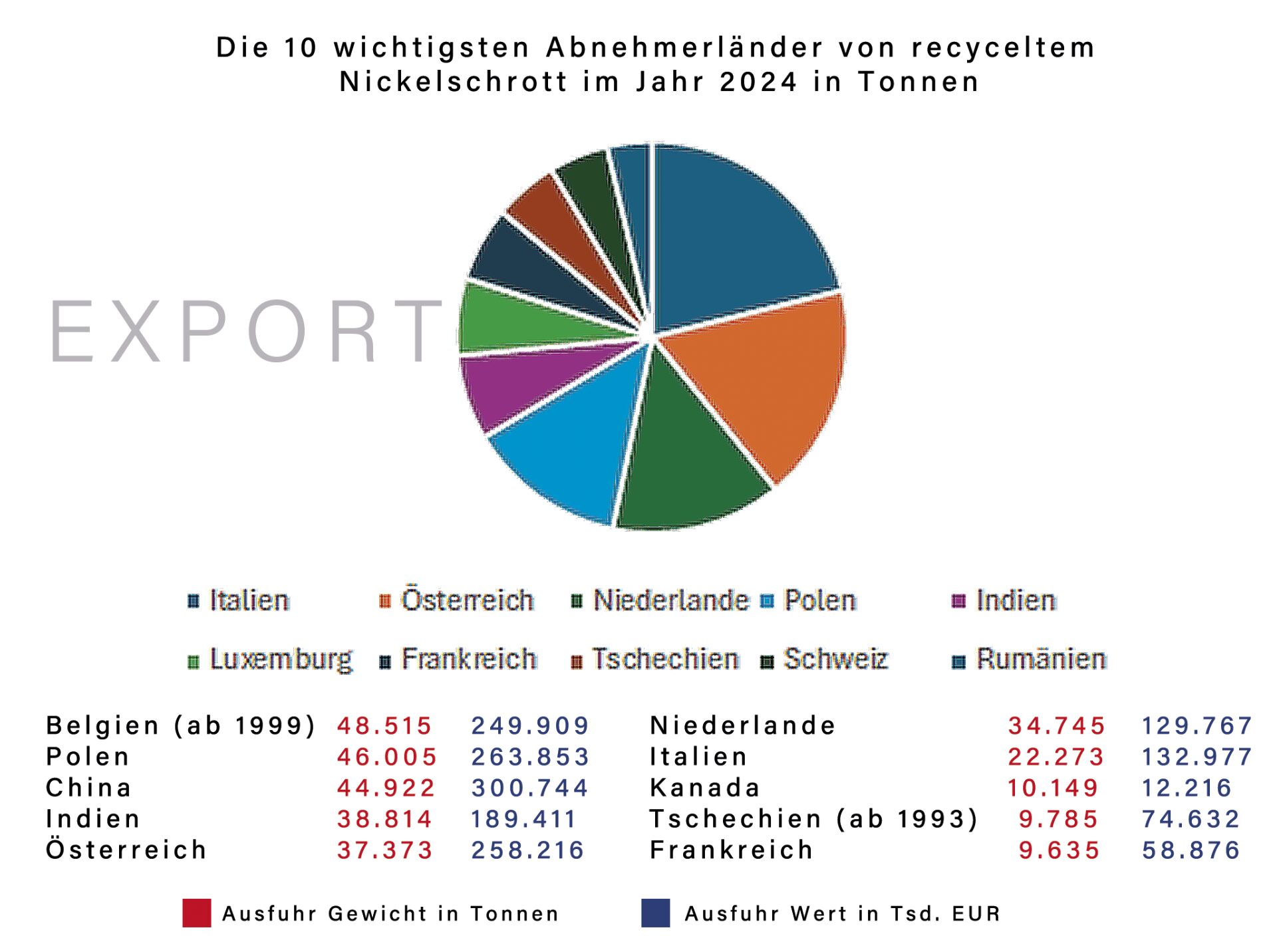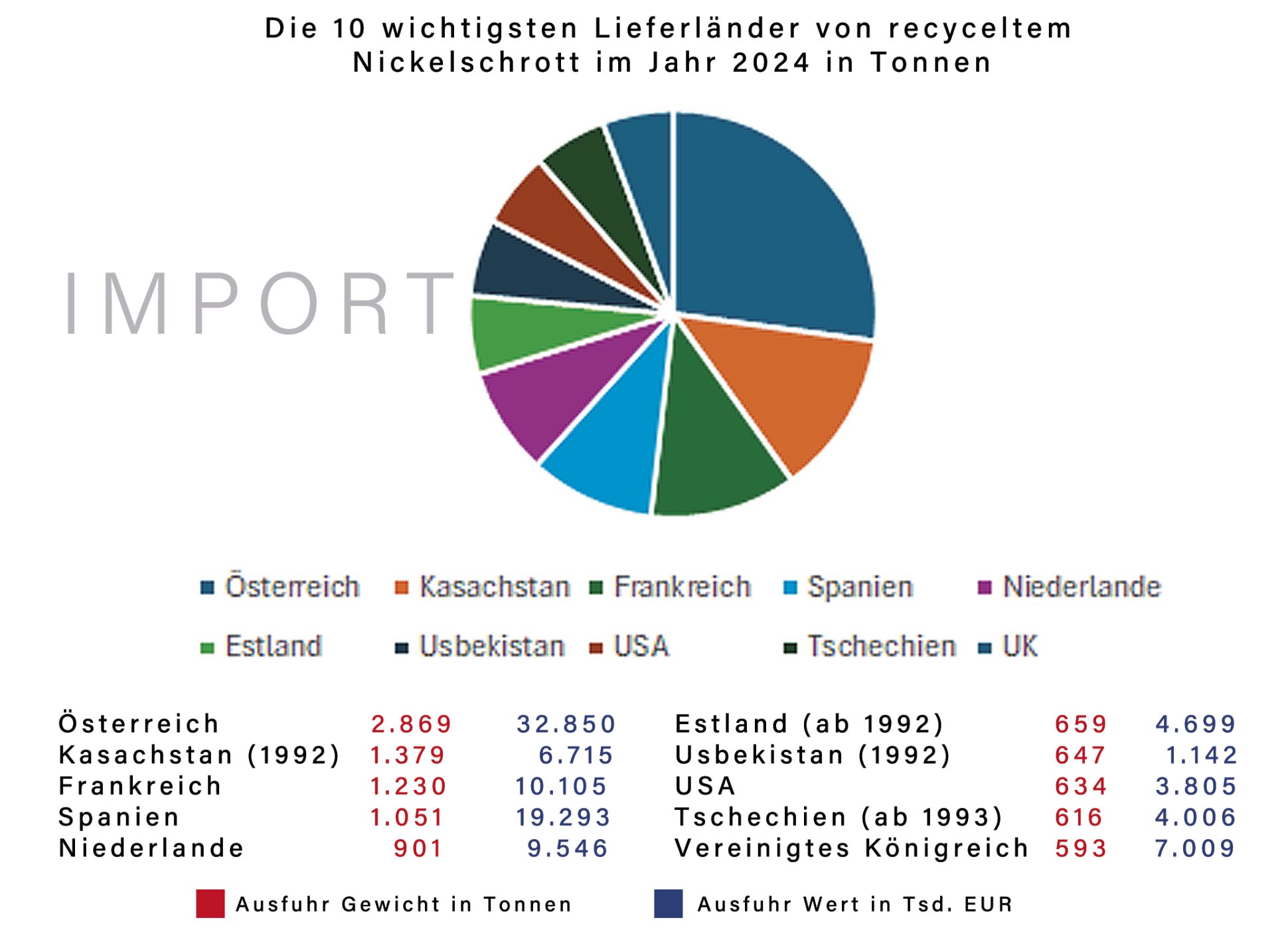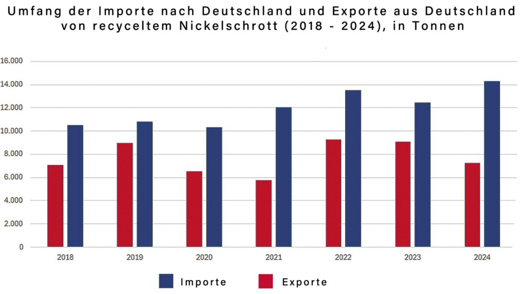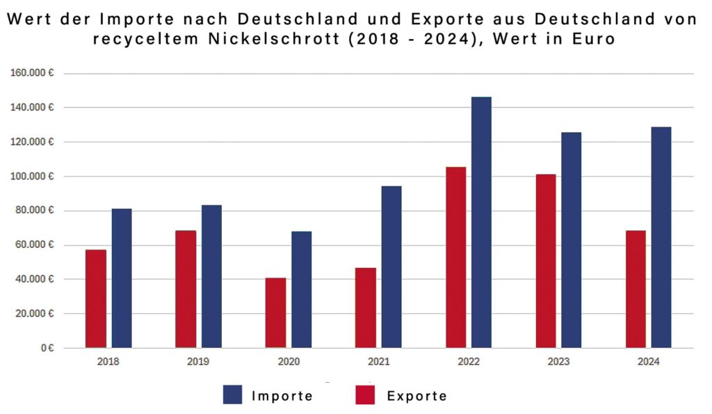 Der deutsche Außenhandel mit Nickelschrott weist in den Jahren 2018 bis 2024 stets einen Importüberschuss auf. Ein Teil der Nickelschrottimporte und des heimischen Entfalls bleibt im Inland und werden von einigen Betrieben zu Nickelbasislegierungen oder Superlegierungen weiterverar- beitet. Ein anderer Teil des Nickelschrotts wird für die Auflegierung im Edelstahl verwendet.
