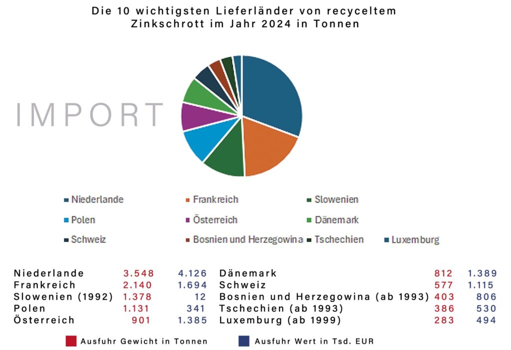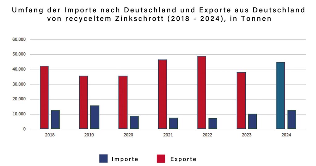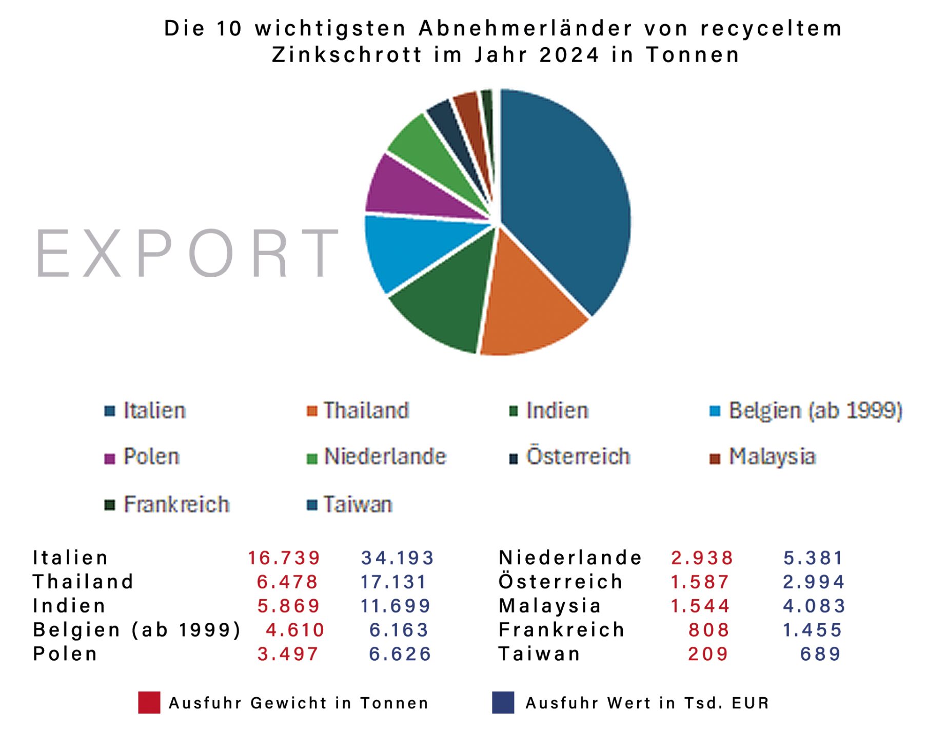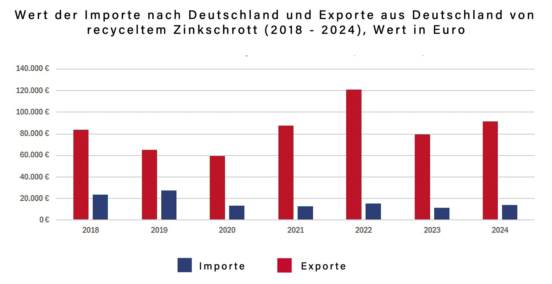 Der deutsche Außenhandel mit recyceltem Zinkschrott weist in den Jahren 2018 bis 2024 stets einen Exportüberschuss auf. Dies liegt vor allem daran, dass in Deutschland signifikante Schmelzkapazitäten abgebaut wurden. Der wichtigste Abnehmer von deutschem Zinkschrott ist seit Jahren Italien, die in diesem Bereich eine starke weiterverarbeitende Industrie haben.