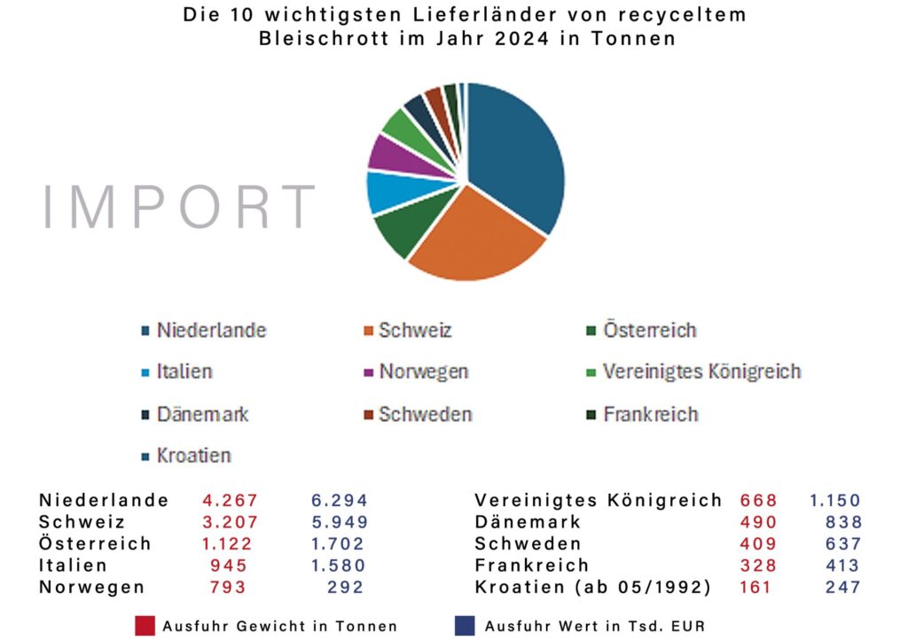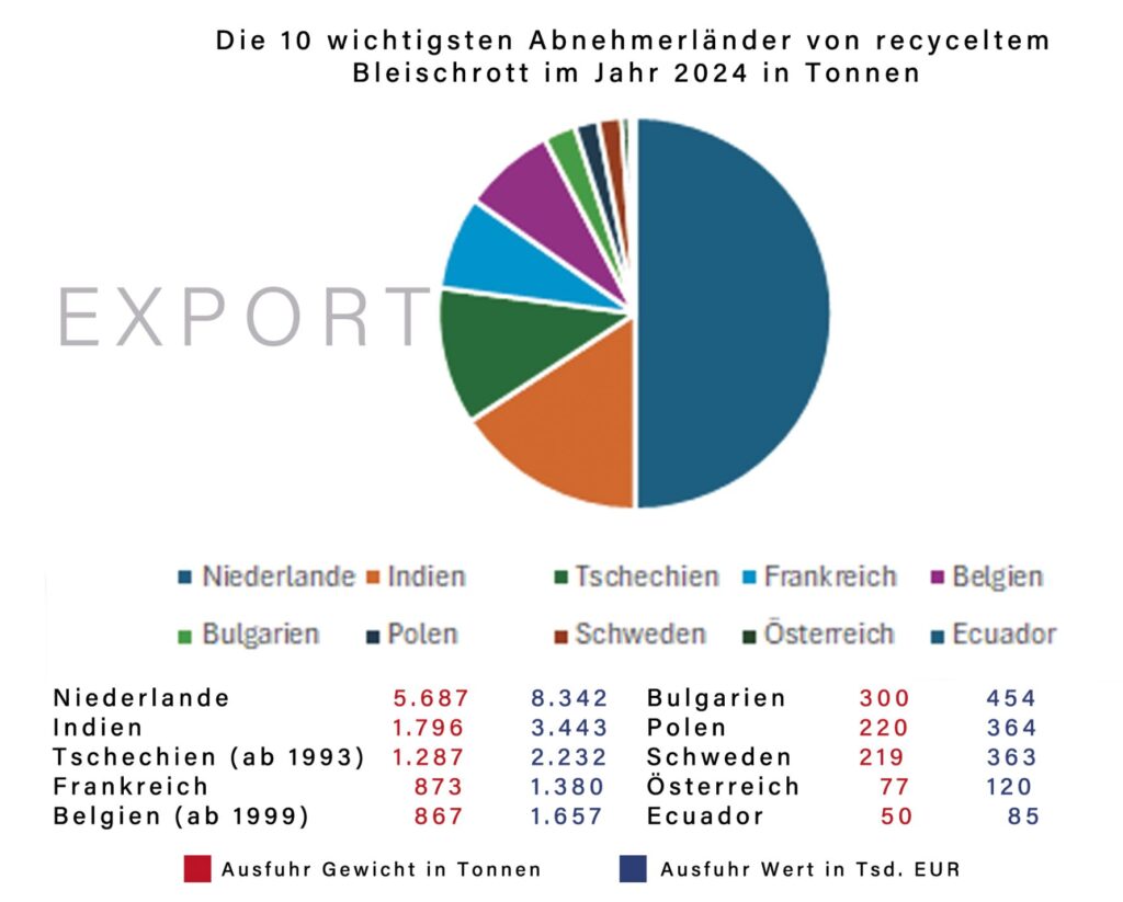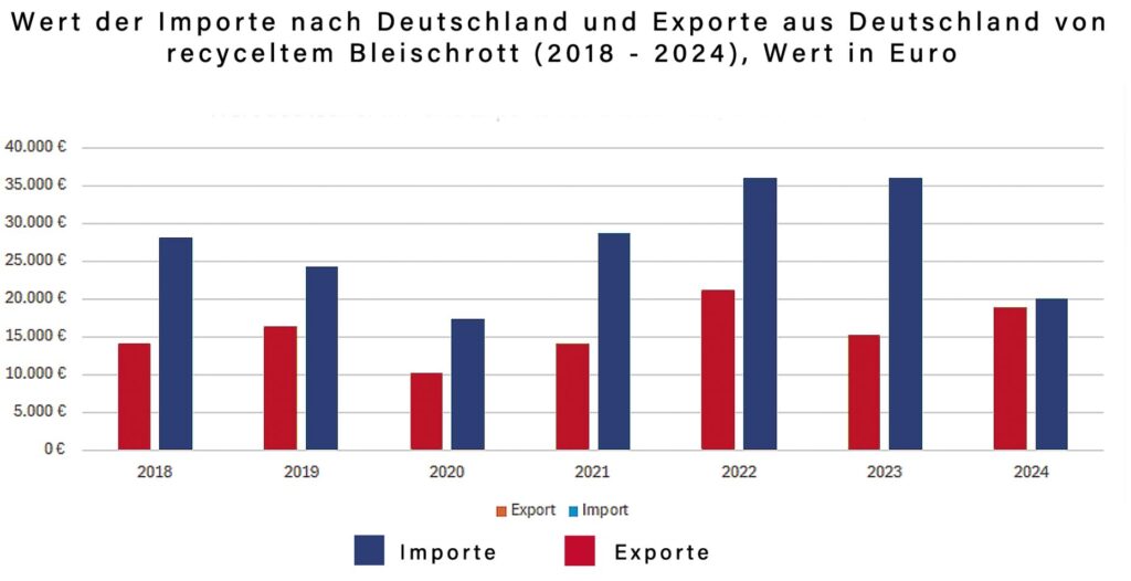 Der deutsche Außenhandel mit Bleischrott weist in den Jahren 2018 bis 2024 stets einen Importüberschuss auf. Hier gilt es zu konstatieren, dass die Verarbeiter die erforderte Qualität nicht in den verfügbaren Mengen auf dem deutschen Markt einkaufen können und somit auf den internationalen Handel angewiesen sind.
