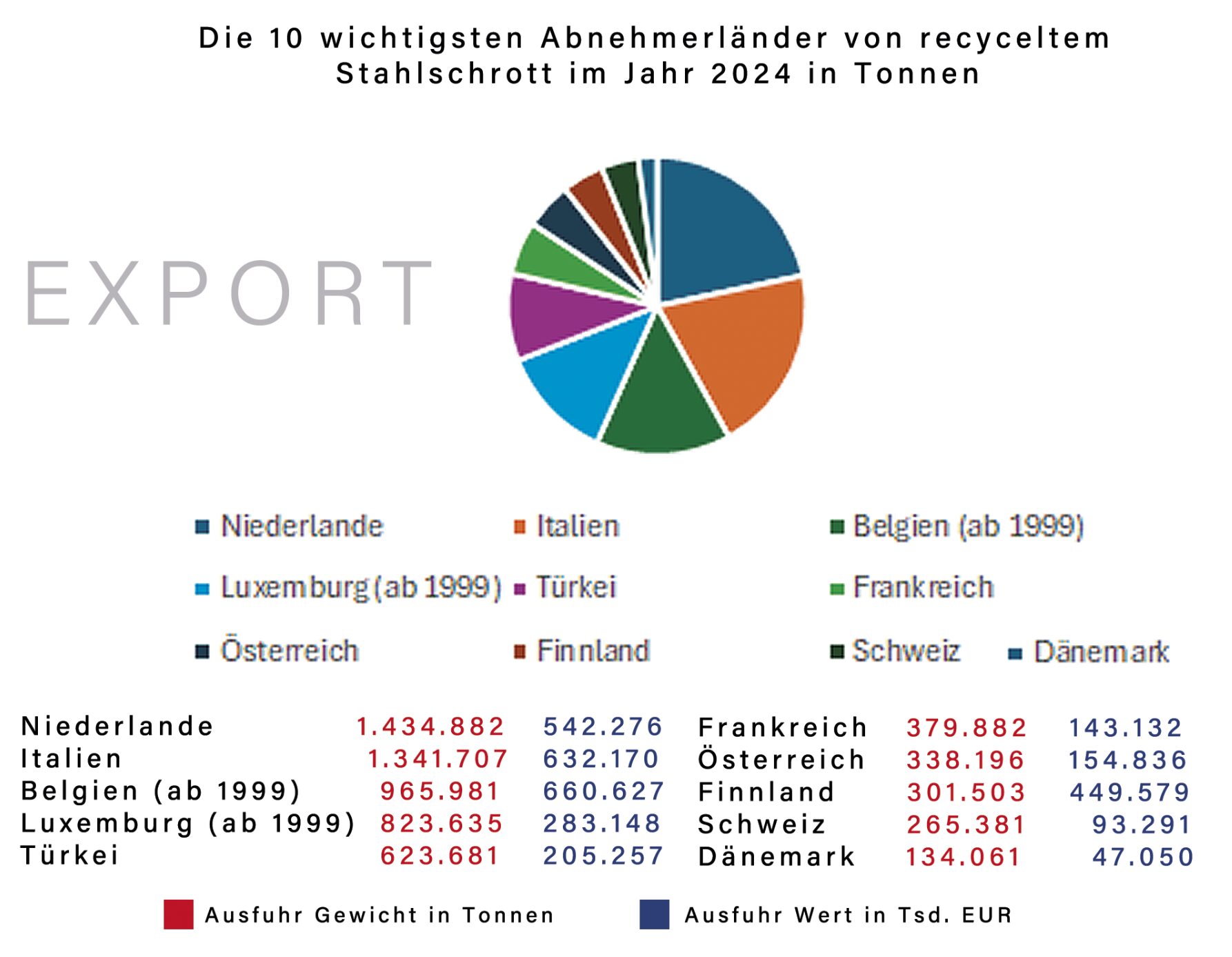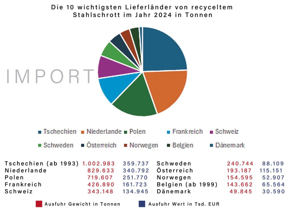 Die Schrottausfuhren gingen 2024 um 11,7%, bzw. etwa 940.000 t zurück. Hauptursachen hierfür waren die verringerten Exportmengen nach Italien, in die Niederlande sowie die Direktausfuhren in die Türkei, die zusammen mehr als die Hälfte des gesamten Rückgangs ausmachten. Im Gegensatz dazu stiegen die Schrottimporte nach Deutschland im vergangenen Jahr um etwa 22%, was rund 790.000 t mehr als im Vorjahr entspricht. Diese Entwicklung trug erheblich zur Deckung des inländischen Schrottbedarfs bei. Der resultierende Saldo aus den Veränderungen bei Exporten und Importen führte zu einer Entlastung des zusätzlichen Schrottbedarfs der Verbraucher von etwa 1,7 Mio. t.